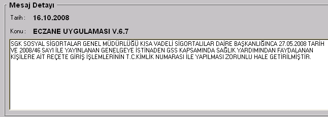 SGK SOSYAL SİGORTALAR GENEL MÜDÜRLÜĞÜ KISA VADELİ SİGORTALILAR DAİRE BAŞKANLIĞINCA 27.05.2008 TARİH VE 2008/46 SAYI İLE YAYINLANAN GENELGEYE İSTİNADEN GSS KAPSAMINDA SAĞLIK YARDIMINDAN FAYDALANAN KİŞİLERE AİT REÇETE GİRİŞ İŞLEMLERİNİN T.C.KİMLİK NUMARASI İLE YAPILMASI ZORUNLU HALE GETİRİLMİŞTİR.